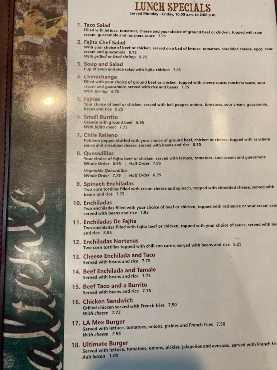 Elcajun's La Mex offers a delicious and diverse menu, making it a great choice for those craving authentic Mexican cuisine. The Lunch Specials are particularly noteworthy, offering a variety of flavorful options. The Taco Salad, a classic Mexican dish, combines fresh ingredients and crunchy taco shells, perfect for a satisfying meal. For something a bit heartier, the Fajita Chef Salad is an excellent choice, featuring sizzling fajitas paired with a bed of greens and toppings. If you're in the mood for something comforting, the Soup and Salad combo is a light yet filling option. The Chimichanga offers a crispy, deep-fried tortilla filled with flavorful fillings, ideal for those who enjoy a crunch with their meal. For a true Mexican feast, the Fajitas are a must-try, with seasoned meat served on a hot skillet, accompanied by tortillas, rice, and beans. With such a broad selection of dishes, Elcajun's La Mex's menu promises to satisfy every palate, making it a go-to spot for a satisfying and flavorful dining experience.